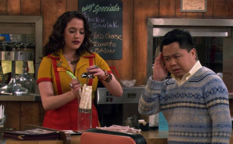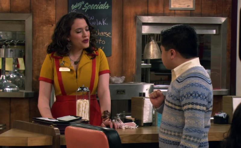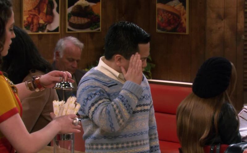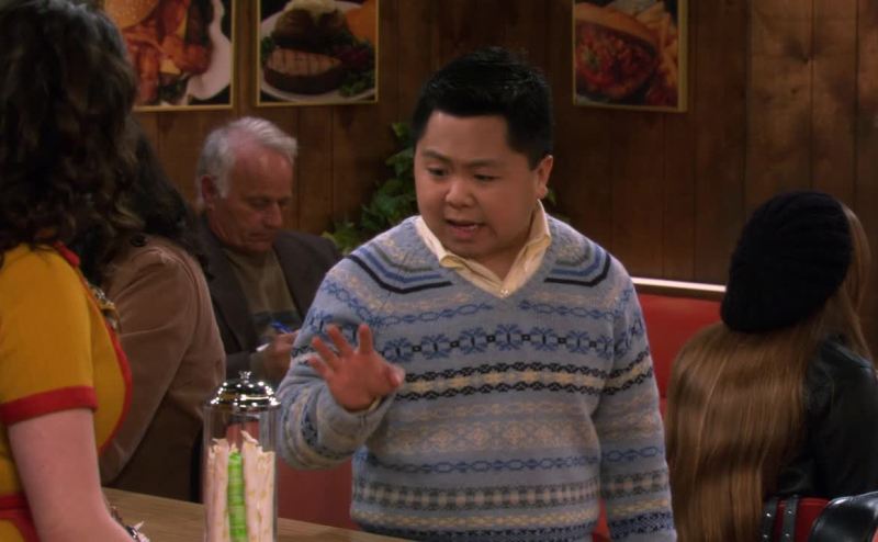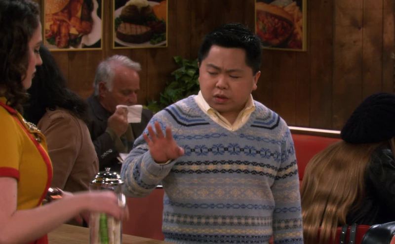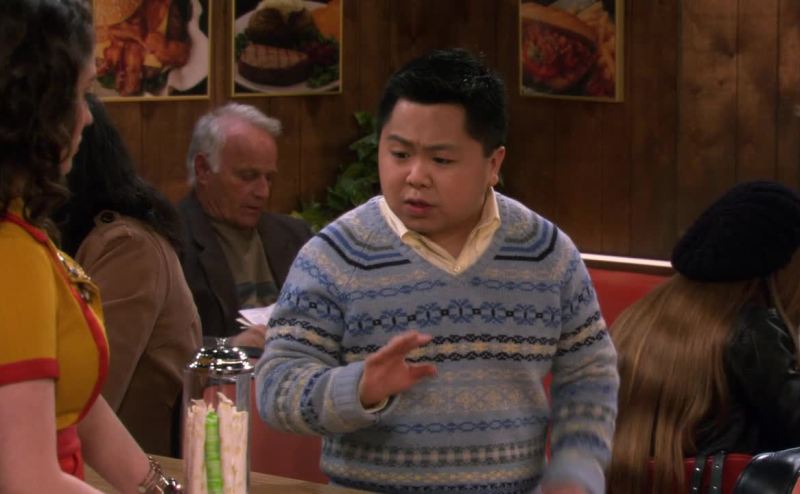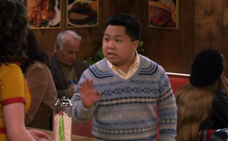 in a boys' v-neck sweater.