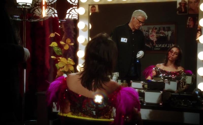 ...in her dress, sitting at her vanity...