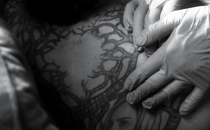 In his back, in the middle of that tree