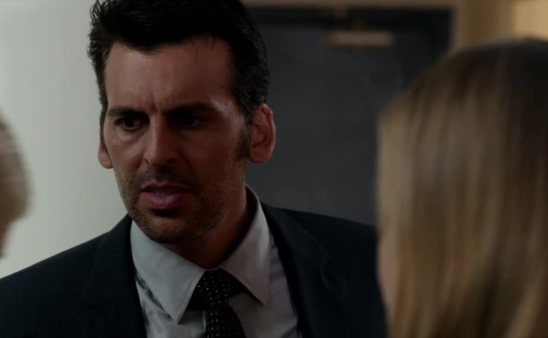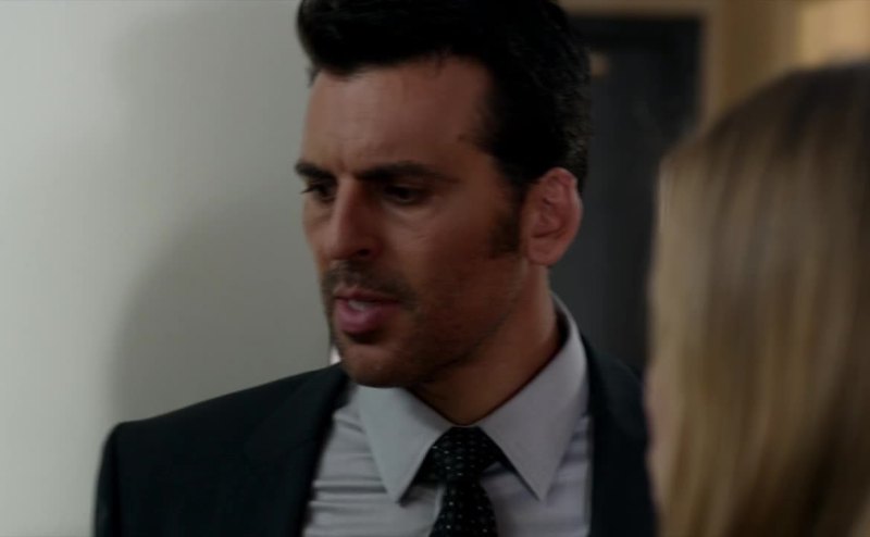 Dark hair, strong jaw, muscles.