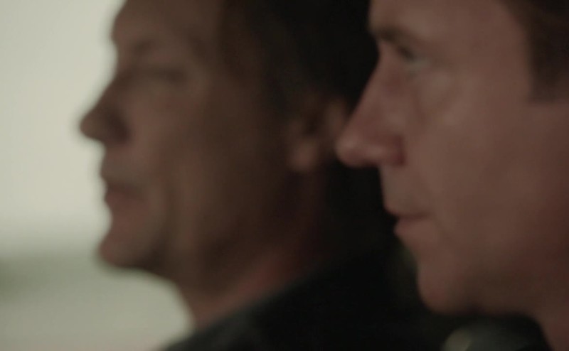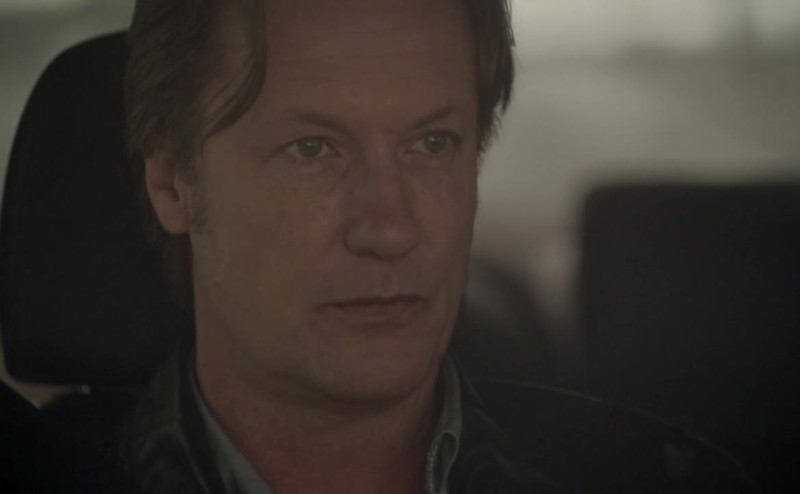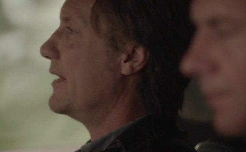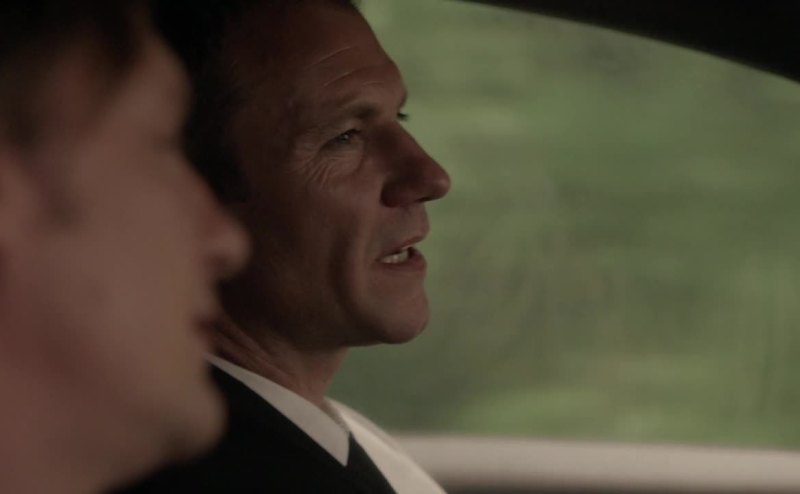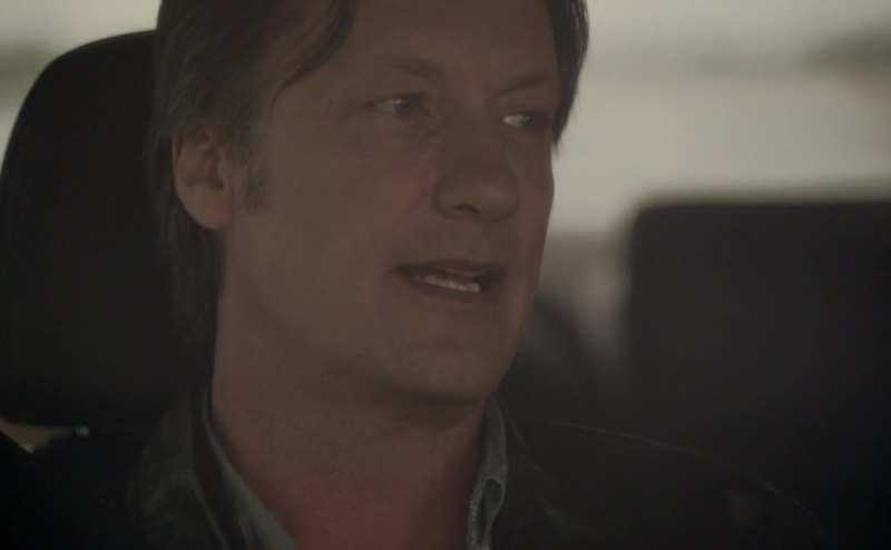 Black, well built, sunglasses. Chews on a toothpick.