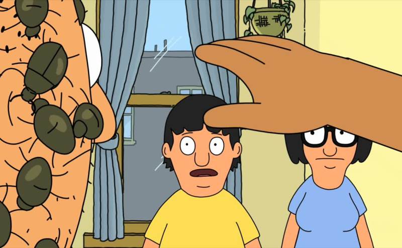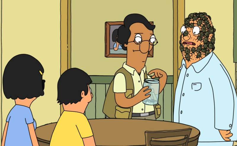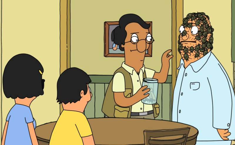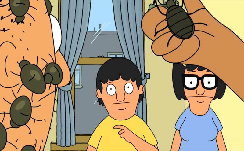 Teddy, making jokes, covered with bugs.