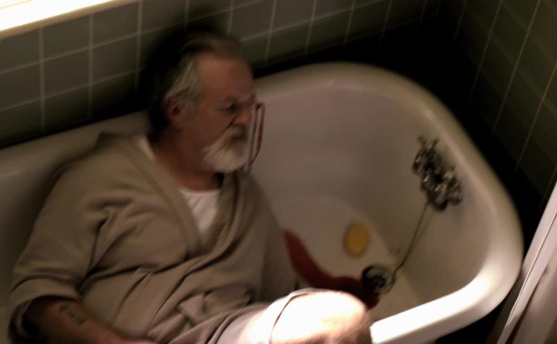 find him on floor in bathroom in bathrobe,