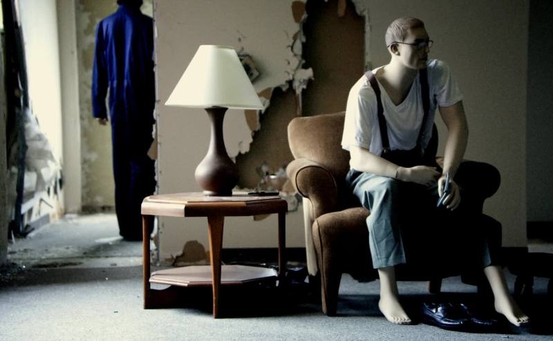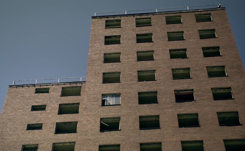 The top floor apartment on the west wall has been outfitted with mannequins,
