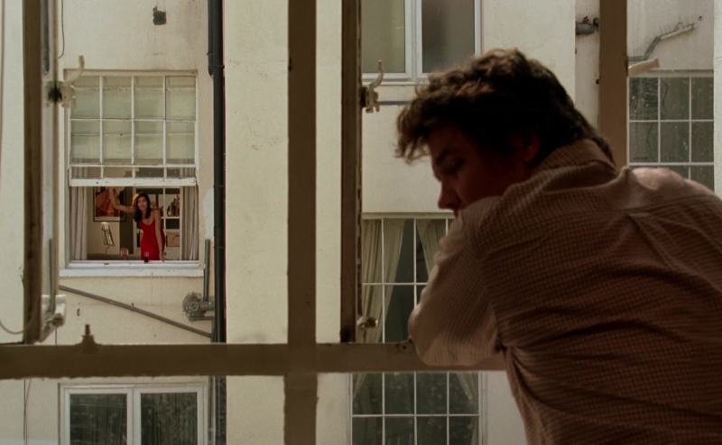 the beautiful creature in red across the way,