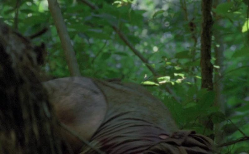 roasting squirrels over a fire in the woods.