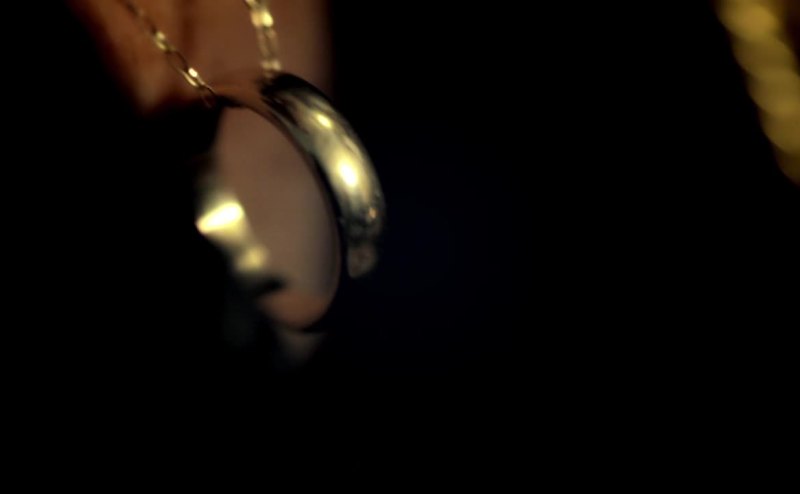 She's got a man's wedding ring on a chain around her neck,