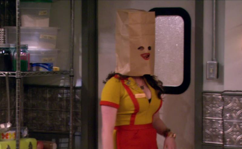 wearing a paper bag.