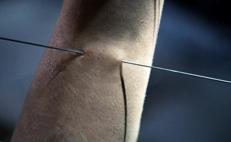 而这个伤口是由刀被扔进胸膛所致